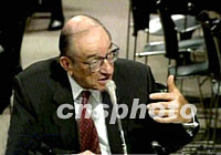 美國聯邦儲備委員會主席格林斯潘當地時間24日在華盛頓向參院銀行委員會作證。他說,如果經濟狀況不見好轉,央行將再度減息。中新社圖