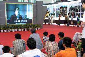圖:《反對(duì)邪教崇尚文明》展覽閉幕 2001年07月30日 19:30 ![]() 觀眾席地而坐觀看反邪教影片。新華社記者 于小平 攝