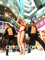 身著歐迪芬內衣的女模特近日在北京東安市場的內衣展示會上與男模隨著歡快的樂曲翩翩起舞。中新社記者 史利 攝