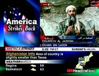 圖:美國(guó)電視節(jié)目中的本·拉登 2001年10月08日 10:57 ![]() 美軍協(xié)同英軍開(kāi)始對(duì)阿富汗境內(nèi)恐怖組織訓(xùn)練營(yíng)以及塔利班政權(quán)的軍事設(shè)施展開(kāi)軍事打擊。其后不久,卡塔爾一家電視臺(tái)首先播放了本·拉登講話的錄像。拉登說(shuō):“我對(duì)真主起誓,除非巴勒斯坦人民能夠享受到和平,否則美國(guó)人將永遠(yuǎn)不知和平為何物。”美國(guó)有線電視網(wǎng)(CNN)在其黃金時(shí)間的節(jié)目中,反復(fù)播放拉登的錄相,提醒人們警惕新的恐怖報(bào)復(fù)行動(dòng)。 |