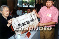 辛亥革命老人、孫中山先生秘書黃展云的女兒黃以雍,十一日以九十三歲的高齡專程赴長樂市,為其父于一九二七年創(chuàng)辦的“營前模范村”后人林泉送上父親當年親筆提寫的匾額。中新社圖 陳勇 攝