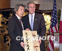 組圖:布什會見小泉純一郎 2001年10月20日 16:10 ![]() 10月20日,美國總統布什(右)在上海下榻的酒店會見日本首相小泉純一郎。圖為布什向小泉贈送棒球手套。中新社圖 ![]() 10月20日,美國總統布什在下榻的酒店會見日本首相小泉純一郎。圖為小泉純一郎(左)向布什贈送禮品。中新社圖