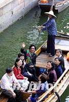 香港特別行政區(qū)長官董建華的夫人趙洪娉十月二十一日與參加上海APEC領導人峰會的首腦夫人一起在水鄉(xiāng)周莊游船,圖為她向岸邊的市民招手。中新社記者 潘索菲 攝