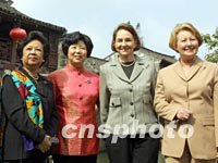APEC首腦夫人21日暢游“中國第一水鄉(xiāng)”。香港特首夫人趙洪娉(左)、加拿大克雷蒂安總理夫人艾琳·克雷蒂安(右二)、澳大利亞霍華德總理夫人珍妮特·霍華德(右)與陪同游玩的江蘇省副省長張連珍在周莊一起合影。中新社記者 潘索菲 攝