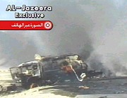 卡塔爾電視臺播出被炸毀運油車的片段。 香港明報 圖