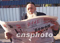 一位新疆維吾爾族七旬老翁12日在北京街頭,仔細地閱讀報道中國入世新聞的報紙。中新社記者 張勤 攝