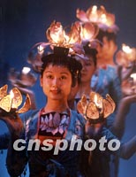 一隊桂林少女扮作荷花仙子,為新年伊始到此的中外游客表演夜色荷燈舞。中新社記者 賈國榮 攝