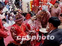 圖:佛山民俗文化節(jié)首次舉辦中式古典集體婚禮 2002年01月13日 09:58 ![]() 佛山民俗文化節(jié)首次舉辦中式古典集體婚禮,新人在萬福古戲臺上拜堂別有一番情趣。圖為伴娘捧著喜糖托盤,讓新人敬獻給雙親。中新社圖 辛述之 攝 |