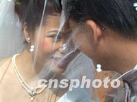 香港農歷新年前夕,有情人終成眷屬。臨近農歷新年,香港許多新人紛紛擇日成婚。圖為一對新婚夫婦在文化中心廣場拍攝婚紗時,含情脈脈地沉醉在愛河里。中新社傳真 盧峰 攝