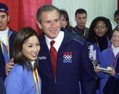 第十九屆冬季奧林匹克運動會開幕式組圖 2002年02月09日 11:26 ![]() 本屆冬季奧運會會旗入場。(美聯圖) ![]() 美國運動員代表和紐約的消防員、警察代表持世貿中心破損的美國星條旗入場。(美聯圖) 冬奧會開幕式會場鳥瞰。 ![]() 美國總統布什開幕式前與美籍華裔知名花樣滑冰選手關穎珊合影。