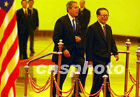 中新社北京二月二十一日電 題:江澤民主席主持儀式歡迎布什總統 中新社記者 朱大強 早春二月,美國總統喬治·沃克·布什來到北京,來到人民大會堂,受到中國國家主席江澤民的熱烈歡迎。 今天的大會堂北大廳,地上鋪著紅地毯,莊嚴的五星紅旗和星條旗分別豎立在檢閱臺兩側,威武的三軍儀仗隊正面排列、記者們的攝像和攝影鏡頭調準焦距…… 上午十一時,江澤民和夫人王冶坪在大會堂北大廳門口歡迎布什和夫人勞拉。兩國元首熱烈握手,這是自去年十月他們在上海會晤四個月后首次在北京見面。 布什總統身著深色西裝,系著蘭色領帶,春風得意。 在相互介紹雙方參加歡迎儀式主要官員后,江澤民主席與布什總統走上檢閱臺本國國旗一側,江澤民主席夫人王冶坪和布什總統夫人勞拉站立其后。軍樂隊奏響美國國歌和中國國歌。之后,布什總統在江澤民主席的陪同下,檢閱儀仗隊,當走到中國人民解放軍軍旗前時,布什立正向軍旗行注目禮。 訪問北京是布什時隔二十多年后故地重游。上個世紀七十年代中期,布什的父親老布什出使中國時,他曾來北京探望過父母。所以,布什對北京并不生疏,所不同的是北京的發展太快了。 更有新意的是今天巧為尼克松總統三十年前訪華紀念日,作為第五十四屆美國總統,布什踏著尼克松、老布什的足跡訪問中國,使命重大。布什說:中國是一個偉大的國家,美國必須努力與中國發展良好、真誠的關系。 這是一個重要契機,此次江澤民主席與布什總統的會晤,將明確宣示中美兩國保持和擴大的合作領域,取得多方面的積極成果。 十分鐘的歡迎儀式結束了。在軍樂聲中,踏著中國的紅地毯,江澤民主席與布什總統像老朋友一樣,邊走邊交談著,走向會談廳。