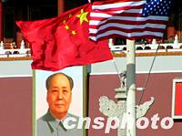 美國總統(tǒng)小布什訪華之際,在北京天安門前飄揚著中美兩國的國旗。中新社圖 杜洋 攝