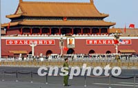 美國總統布什二月二十一日訪問北京,天安門前飄揚著中國的五星紅旗和美國的星條旗。中新社記者 賈國榮 攝