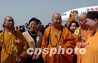 ![]() 赴臺(tái)供奉三十七天的法門寺佛指舍利三十一日抵達(dá)陜西咸陽(yáng)機(jī)場(chǎng)。圖為臺(tái)灣佛教界恭迎委員會(huì)主任委員星云法師(左三)在機(jī)場(chǎng)受到熱烈歡迎。中新社圖 武仲林 攝