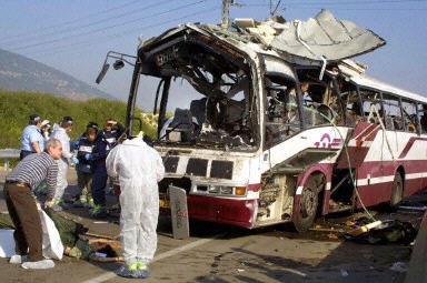 圖文:以色列海法公車遭自殺炸彈襲擊10人死亡 2002年04月10日 14:04 ![]() 圖為被炸彈襲擊的公車。法新社圖 中新網(wǎng)北京4月10日消息:法新社援引以色列醫(yī)院方面的消息說,今天在以色列北部城市海法的公車自殺炸彈襲擊事件中,至少有10人死亡,另有20人受傷。 當?shù)剀姺诫娕_的報道也援引紅十字會性質(zhì)組織的消息說,至少有10人死亡。據(jù)目擊者說,這次爆炸將遇襲公車的車頂炸穿。 而路透社的報道則說,上述緊急救援組織的的官員說,有8人在爆炸中死亡。以色列的媒體早先報道的死亡數(shù)字為10人。 報道還援引警方和救援工作者的消息說,一名自殺炸彈襲擊者今天上午交通高峰期在一輛擁擠的公車上引爆炸彈,造成至少8人死亡,12人受傷。 哈馬斯組織軍事派別宣稱對海法自殺炸彈襲擊負責 中新網(wǎng)北京4月10日消息:卡塔爾半島電視臺報道說,哈馬斯組織的軍事派別今天宣布對發(fā)生在以色列北部城市海法的自殺炸彈襲擊事件負責。 哈馬斯組織的“埃澤丁——卡薩姆旅”打電話給半島電視臺駐西岸城市拉姆安拉的辦公室,宣稱對此事負責。 一名自殺炸彈襲擊者今天上午交通高峰期在海法市一輛擁擠的公車上引爆炸彈,造成至少10人死亡,約20人受傷。 以色列總理沙龍的一名助手聲稱,巴勒斯坦領(lǐng)導人阿拉法特應(yīng)對這起恐怖襲擊事件負責。 巴勒斯坦:海法襲擊是對沙龍骯臟戰(zhàn)爭的“自然反應(yīng)” 中新網(wǎng)北京4月10日消息:巴勒斯坦政府表示,今天發(fā)生在以色列城市海法的公車爆炸事件是對以色列總理沙龍“骯臟戰(zhàn)爭的自然反應(yīng)”。 據(jù)法新社報道,巴勒斯坦內(nèi)閣秘書阿卜杜拉赫曼說:“沙龍對此負有責任。他是對巴勒斯坦人民和民族權(quán)力機構(gòu)發(fā)起骯臟侵略的人。” 阿卜杜拉赫曼還說:“這是對這場骯臟戰(zhàn)爭和發(fā)生在難民營的事件的自然反應(yīng)。” 哈馬斯組織的軍事派別今天打電話給半島電視臺駐西岸城市拉姆安拉的辦公室,宣稱對此海法的自殺炸彈襲擊事件負責。 以色列官員稱阿拉法特應(yīng)對自殺炸彈襲擊負責 中新網(wǎng)北京4月10日消息:以色列官員今天說,巴勒斯坦領(lǐng)導人阿拉法特應(yīng)為海法市的自殺炸彈襲擊事件負責。 據(jù)法新社報道,以色列總理沙龍的助手說:“亞瑟·阿拉法特對這起恐怖襲擊事件負責,這再次證明他對恐怖主義無所作為,相反他在鼓勵這種行為。” 這名以色列官員還說,這次襲擊事件“只能證明繼續(xù)3月29日開始的對恐怖主義基礎(chǔ)組織的軍事行動是合理的”。 自從3月29日海法市發(fā)生自殺炸彈襲擊事件以來,以色列就對西岸地區(qū)發(fā)動大規(guī)模軍事行動,并將巴勒斯坦領(lǐng)導人阿拉法特圍困在拉姆安拉的總部。