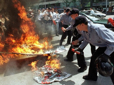 圖文:韓國民間團(tuán)體集會(huì)抗議日本首相靖國參拜 2002年04月22日 16:07 ![]() 韓國在日本戰(zhàn)爭中的受害者,強(qiáng)烈抗議日本首相參拜靖國神社。圖為在漢城韓國警察試圖熄滅抗議者燃燒的日本旗幟。法新圖