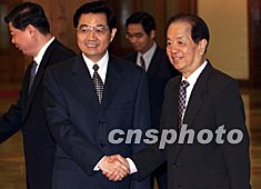 ![]() 中國國家副主席胡錦濤二十三日離開北京,前往馬來西亞、新加坡、美國訪問。國務(wù)院副總理錢其琛等在北京人民大會堂送行。中新社記者 毛建軍 攝