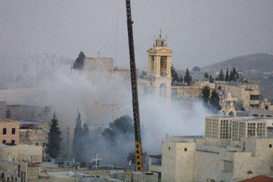 以巴官員將會談 討論伯利恒主誕堂對峙危機(圖) 2002年04月23日 16:23 濃煙巨浪中的伯利恒主誕堂。(法新圖) 中新網北京4月23日消息:以色列電臺報道說,以巴官員今天將舉行會談,試圖解決伯利恒市主誕堂長達三周的對峙局面。 德新社援引報道說,這次會談原定上周舉行,但最后被巴勒斯坦領導人阿拉法特取消。 另據路透社報道,伯利恒市長已經證實,以巴官員今日將會首次會晤,商討解決這個問題。 預料會議會在當地時間上午11:00舉行。伯利恒市長稱這是初步會談,希望能夠取得突破。以色列軍方亦證實正在為會議作準備。