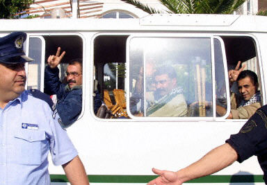 圖:12名巴武裝人員離開塞浦路斯前往歐盟6國 2002年05月22日 15:14 12名滯留在塞浦路斯的巴勒斯坦武裝人員22日動身前往機場,并將乘坐兩架飛機分別前往6個歐盟國家。法新供中新