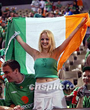 圖:德國(guó)VS愛(ài)爾蘭 性感女球迷高舉愛(ài)爾蘭國(guó)旗助威 2002年06月05日 19:37 ![]()