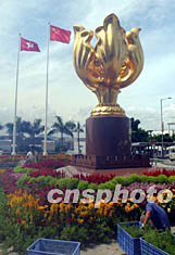 圖:金紫荊廣場(chǎng)布置鮮花迎回歸五周年慶典 2002年06月28日 20:39 ![]() 香港會(huì)展中心金紫荊廣場(chǎng)將在7月1日舉行隆重的升旗禮,6月28日?qǐng)@藝工人頭頂烈日在金紫荊廣場(chǎng)布置鮮花,迎接回歸五周年慶典。洪少葵 攝