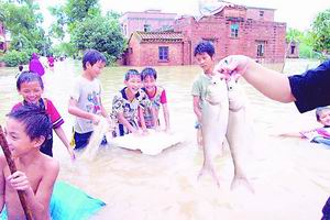吳川頓谷村委會的名利村是受災最為嚴重的村莊之一。昨天,記者在該村采訪時見到,該村的400多戶(1900多人)人家的房屋全被洪水淹浸,有的樓房的第一層全被浸沒,村子里的水深竟達1~2米左右,村民只能淌著齊腰深的洪水出入,有不少村民在自家屋前撒起了魚網……