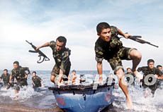 圖:解放軍沖鋒舟武裝搶灘登陸演習 2002年08月03日 17:28 ![]() 沈陽軍區官兵今夏在東北某海域進行水上多項軍事課目訓練,演習武裝搶灘登陸,向既定目標快速挺進。作者:馬檣
