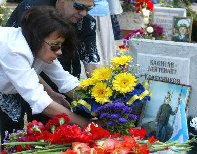 圖:莫斯科紀念"庫爾斯克號"核潛艇失事兩周年 2002年08月12日 22:36 ![]() 俄羅斯首都莫斯科12日舉行“庫爾斯克號”核潛艇失事兩周年紀念儀式,為118名死難者而設的紀念碑在莫斯科揭幕,幾十名海員及遇難者親友沉痛悼念葬身大海的海軍官兵。圖為遇難者家屬在紀念碑前擺放鮮花。