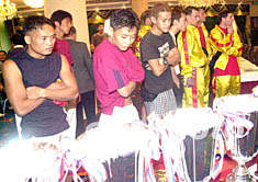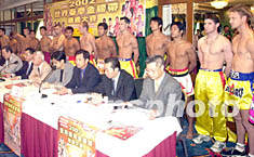 ![]() 2002世界泰拳金腰帶慈善大賽組委會十六日在澳門舉行新聞發(fā)布會,參賽的二十名各國選手在會上亮相。據(jù)悉,本次大賽的所有收益將撥捐中國水災地區(qū)、澳門同善堂、澳門紅十字會及澳門工會聯(lián)合會職工福利基金會。李剛 攝