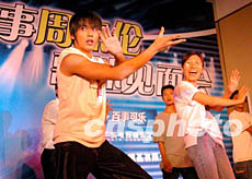 八月三十日,樂壇人氣小天王周杰倫在廣州與來自廣東、海南、湖南的歌迷舉行見面會,并刮起一陣“龍卷風”。圖為周杰倫與歌迷一起表演龍拳。作者:陳文