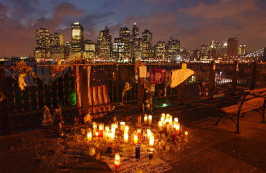 2001年9月20日,911恐怖事件發生一周后,紐約布魯克林區和曼哈頓中間的東河岸邊,擺滿了紀念死難者的蠟燭。(春風)
