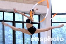 中國藝術體操隊的選手們日前在北京進行亞運的最后備戰,力爭包攬該項目的兩枚金牌。圖為十六歲的孫丹在帶操的訓練中。作者:武仲林