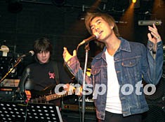 臺灣歌星任賢齊,10月13日一頭金發和牛仔裝在香港一家以男士為主的酒吧舉辦的“舉杯Party”上演唱。中新社圖 任晨鳴 攝