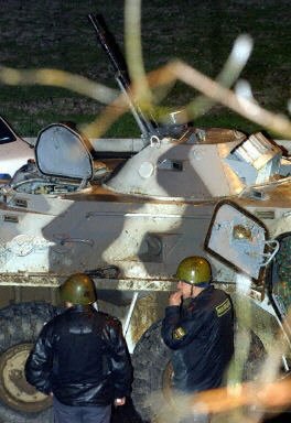 俄羅斯警方在發生劫持人質事件的劇院外高度戒備。圖為裝甲車在劇院外警戒。