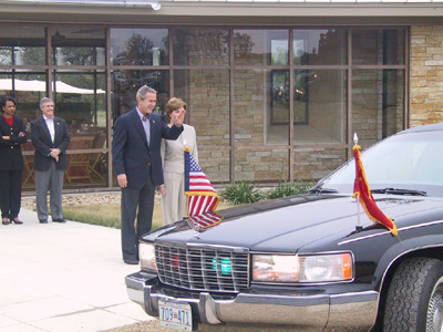 當江澤民和夫人王冶坪乘專車抵達牧場正門口時,提早迎候在那里的布什總統和夫人勞拉走向前去,與江澤民夫婦熱情握手。布什說,這個牧場是我溫暖的家,我和勞拉非常高興在家里接待你和王冶坪女士。