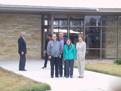 會談后,布什總統駕車陪同江主席夫婦參觀他的牧場。中午布什夫婦在家中設宴款待江澤民和夫人。