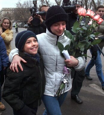 10月29日,已有三百多名在莫斯科劫持人質事件中受傷的人質結束了在醫院的治療回到了各自的家中。圖為一名男孩微笑著從醫院迎接她的母親回家。