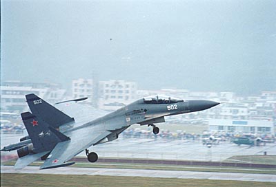 蘇-30雙座超音速重型戰斗轟炸機冒雨起飛進行飛行表演。