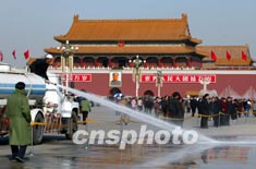 清潔工人四日用高壓水車沖刷北京天安門廣場,創造優良環境,迎接即將召開的中國共產黨第十六次全國代表大會。作者:毛建軍