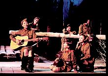導演將這出戲定位為“詩化現(xiàn)實主義戰(zhàn)爭劇”,并用觀賞性很強的俄羅斯歌舞來調(diào)劑原本凝重慘烈的氣氛。既有表現(xiàn)女兵青春形象的歡快的歌曲,也有烘托戰(zhàn)爭殘酷的悲傷曲調(diào),更有象征俄羅斯精神的激昂旋律。
