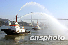 廈門港日前舉行海上消防演練,出動六艘全回轉拖輪在海天碼頭海域進行搶險應急演練。作者:鄭憲
