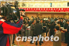 中國共產黨第十六次全國代表大會新聞中心六日晚在北京梅地亞中心舉行酒會,歡迎前來采訪的中外記者。作者:毛建軍