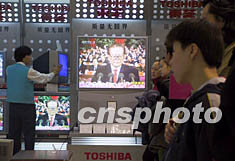 中共十六大十一月八日清晨在北京開幕,北京市民在商場觀看開幕式。作者:張宇