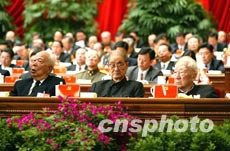 中國共產黨第十六次全國代表大會八日上午在北京人民大會堂舉行,萬里、宋平、薄一波(從左至右)等老同志在主席臺就座出席開幕會。作者:毛建軍