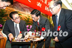 十六大代表、中共中央政治局常委李鵬九日與重慶代表一起討論十六大報告。會后,吳康明代表(右二)拿出一本影集,介紹由李鵬捐款資助的學生的學習與生活情況。作者:毛建軍
