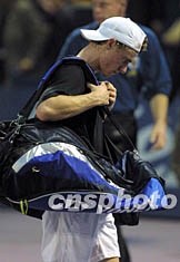 上海十三日晚結束的大師杯小組賽可謂冷門迭起,繼阿加西慘敗后,頭號種子休伊特又以0比2輸給了狀態正佳的西班牙老將莫亞,小組出線形勢不容樂觀。圖為休伊特賽后黯然離場。作者:湯彥俊