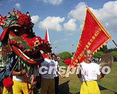?谑辛f市民十四日在萬綠園慶祝集會(huì),海口美蘭區(qū)龍文坊社區(qū)的六十歲老者舞動(dòng)珍藏八十年的彩龍,歡慶中共十六大閉幕。作者:王辛莉