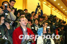 數百名中外記者十五日上午聚焦北京人民大會堂東大廳,等待與新當選的中共中央政治局常委見面