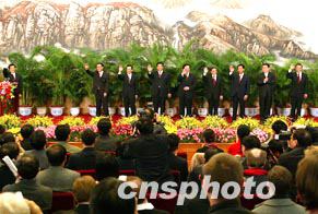新當選的中共中央政治局九名常委向中外記者揮手示意 中新社記者 毛建軍 攝