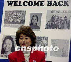 美國勞工部部長趙小蘭二十二日下午回到她的母校紐約賽奧斯特(Syosset)高中。一九七一年,她從這里畢業。二○○一年,她成為美國歷史上首位亞裔內閣成員。為歡迎趙小蘭到來,該校師生特別制作了“歡迎歸來”的展板。作者:陳建